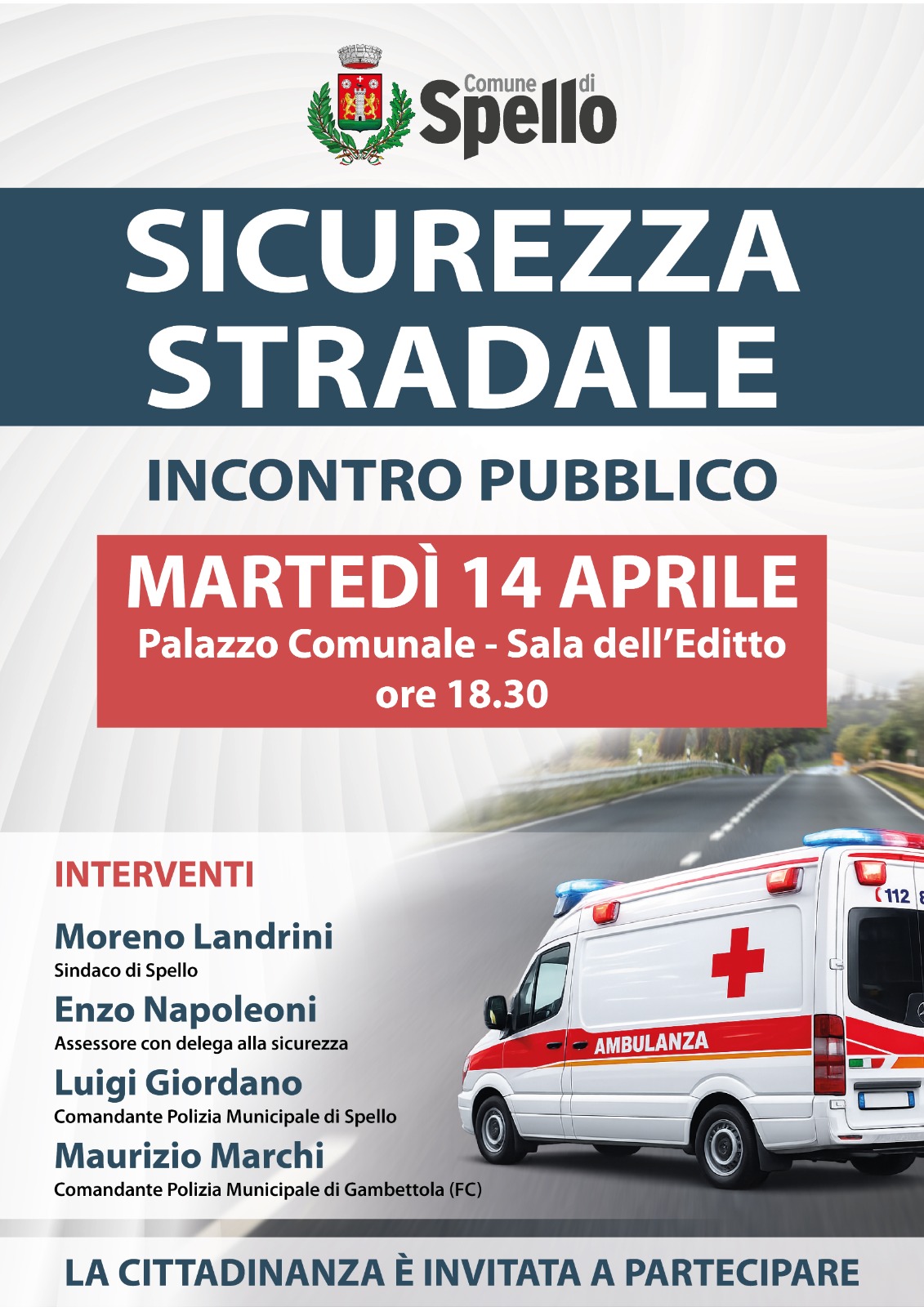 Un incontro pubblico dedicato alla sicurezza stradale per informare e sensibilizzare la cittadinanza sui comportamenti corretti da adottare alla guida e sulle principali novità normative. L’iniziativa, promossa dal Comune di Spello – Settore Polizia Municipale, è in programma per martedì 14 aprile, alle ore 18.30, nella Sala dell’Editto del Palazzo Comunale. Nel corso dell’incontro verranno approfonditi temi fondamentali per la sicurezza di tutti gli utenti della strada: la guida in stato di ebbrezza o sotto l’effetto di sostanze stupefacenti, il rispetto dei limiti di velocità e le conseguenze – sia in termini di sanzioni che di rischi personali e collettivi – derivanti da comportamenti scorretti. Verranno inoltre illustrate le più recenti disposizioni riguardanti i veicoli elettrici, con particolare attenzione all’utilizzo di monopattini elettrici e biciclette a pedalata assistita. Saranno approfonditi aspetti pratici e obblighi previsti dalla normativa, come l’applicazione del contrassegno identificativo e le regole per una circolazione sicura. Interverranno il Sindaco Moreno Landrini, l’assessore con delega alla sicurezza, Enzo Napoleoni, il comandante della Polizia Municipale di Spello, Luigi Giordano e il Comandante della Polizia Municipale di Gambettola (FC), Maurizio Marchi.