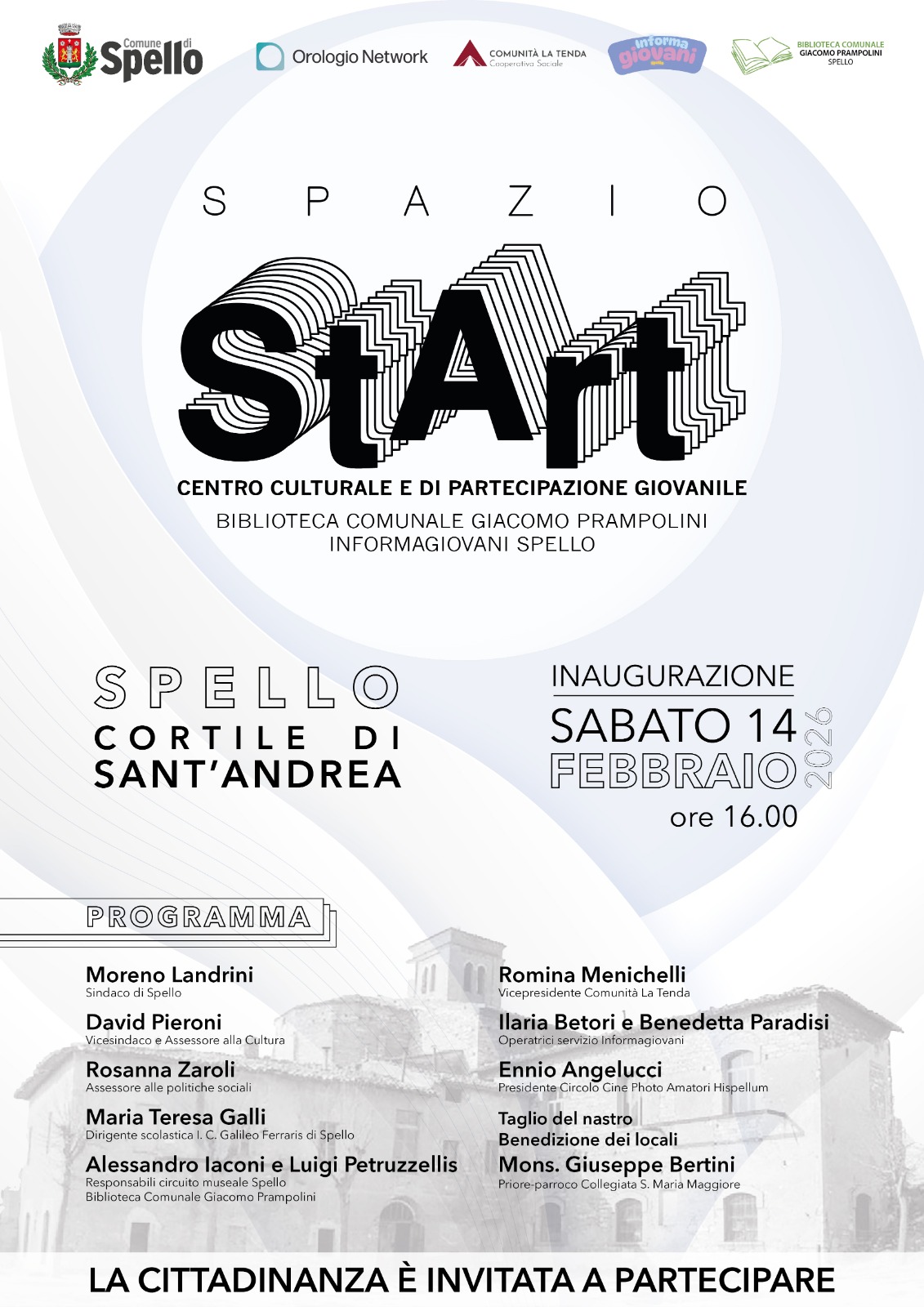 Un luogo dove la memoria storica dialoga con l’innovazione e dove la Comunità, attraverso le giovani generazioni, costruisce nuovi percorsi di crescita culturale e sociale. Sabato 14 febbraio alle ore 16.00, aprirà le sue porte Spazio StArt, il nuovo Centro di Cultura e Partecipazione Giovanile situato negli antichi locali del Cortile di Sant’Andrea. Il Centro prende vita in una sede dal grande valore simbolico: un tempo parte del convento dei Frati Minori Conventuali e successivamente sede dell’Avviamento Professionale fino al 1963. Ora, dopo un’attenta opera di riqualificazione, questi spazi tornano alla città come un ambiente aperto, inclusivo e dinamico dedicato alla cultura, alla creatività e alla partecipazione. Cuore pulsante di Spazio StArt sono la Biblioteca Comunale “Giacomo Prampolini” e il servizio Informagiovani Spello; la prima vanta un patrimonio di oltre 10.000 volumi (sezioni Generale, Ragazzi e Locale) e offre servizi di prestito, assistenza bibliografica e postazioni Wi-Fi.