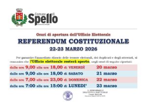 Si comunica che la Commissione elettorale comunale è convocata nella sede del Comune in pubblica adunanza per il giorno 25 febbraio 2026, alle ore 18:00 per procedere alla nomina degli scrutatori che saranno destinati agli uffici di sezione per il Referendum popolare indetto per i giorni di domenica 22 e lunedì 23 marzo 2026. In allegato il manifesto di convocazione.